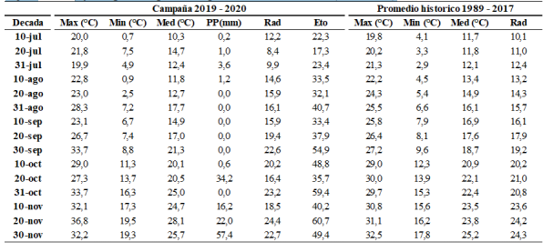 Tabla 1: Valores registrados para la campaña 2019 – 2020 y valores históricos para la serie 1989 – 2017 de temperaturas máxima promedio (Max), mínima promedio (Min), media promedio (Med), precipitaciones acumuladas (PP), radiación solar incidente promedio (Rad, Mj m-2 día-1 ) y evapotranspiración potencial acumulada (ETo, mm)