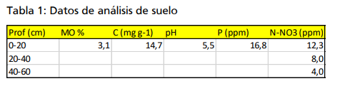 De acuerdo con los datos obtenidos mediante diagnóstico con análisis de suelo (Tabla 1) se fertilizó con 70 kg/ha de fosfato monoamónico (11-52-00) y 80 kg de urea granulada (46-00-00), aplicados a la siembra, con sistema de doble fertilización de la sembradora y 70 kg/ha de urea adicionales aplicados al voleo en preemergencia. En relación a la fertilización con nitrógeno (N) se apuntó a un modelo de 140 – X (siendo X la cantidad de N en kg/ha de N presente en el suelo al momento de la siembra).