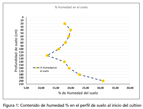 El antecesor fue un cultivo de avena para corte, y al inicio del ensayo se realizó la determinación de agua hasta los 2 m de profundidad (Figura 1). Se realizó la determinación de la densidad de plantas de todos los híbridos. La densidad de plantas promedio obtenidas en el ensayo fue de 69.960 pl ha-1.