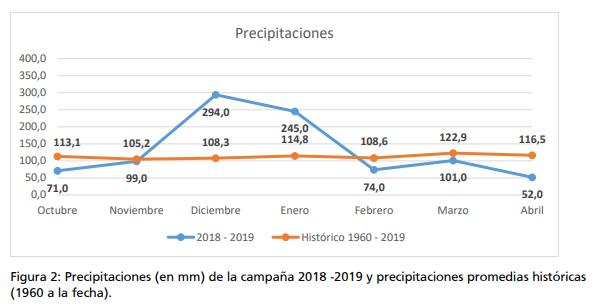 El contenido de humedad del suelo al inicio del cultivo fue suficiente para lograr una siembra de calidad (Figura 1). Durante diciembre las precipitaciones fueron abundantes (Figura 2), lo cual permitió de manera temprana aumentar la oferta hídrica para el cultivo. Las precipitaciones fueron superiores durante los meses de diciembre y enero de la campaña 2018 – 2019 a los valores promedios históricos registrados desde 1960 a la fecha para los mismos meses. Se totalizaron 766 mm desde diciembre de 2018 hasta abril de 2019.