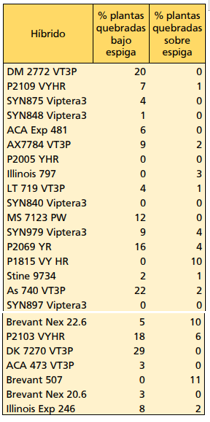 Tabla 2: % de plantas quebradas en los híbridos participantes