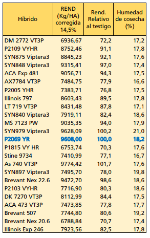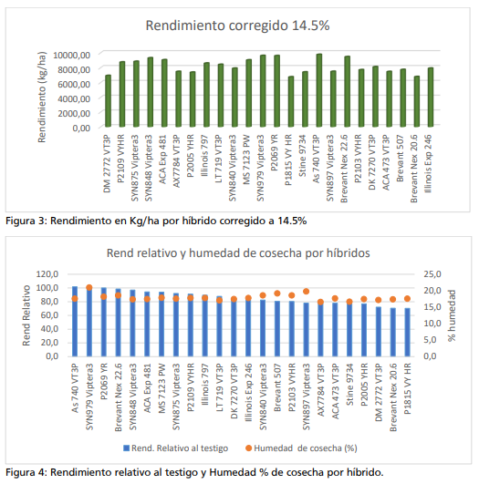 Tabla 3: Híbridos participantes, rendimiento alcanzado en kg/ha corregido 14.5%, rendimiento relativo al testigo y humedad (%) al momento de la cosecha.
