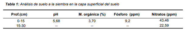 Se condujo un ensayo en la Chacra Experimental Integrada Chascomús (CEI), perteneciente al Ministerio de Agroindustria de la Provincia de Buenos Aires, en el marco del trabajo integrado INTA-MAIBA. El mismo se realizó en siembra directa sobre un suelo de loma perteneciente a la serie Udaondo, clasificado como Hapludol thapto-árgico según la carta de suelos de INTA escala 1:50.000. El cultivo antecesor fue una pastura de alfalfa. El 25 de septiembre se realizó un barbecho químico utilizando 3 l/ha de Glifosato (66,2%) + 150 cc de Lontrel (Clopiralid). El 18 de octubre se pasó un rabasto y la siembra se realizó en directa el 24 de octubre de 2018. Las propiedades del suelo en los primeros 30 cm al momento de la siembra se observan en la tabla 1.