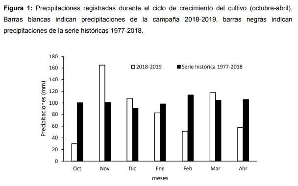 Las precipitaciones registradas durante el ciclo del cultivo definido entre los meses de octubre y abril (613 mm) fueron inferiores a las registradas para el promedio histórico registrado en el partido durante el período 1971-2017 (714 mm) (Figura 1). Las precipitaciones de noviembre (165 mm) permitieron lograr un nacimiento rápido y homogéneo de todos los híbridos. Estas condiciones se mantuvieron durante todo el período crítico (fin de diciembre, principios de enero), lo que permitió asegurar el número de granos por planta (principal componente del rendimiento). Por último, las condiciones de llenado de grano fueron buenas, tanto en precipitaciones como en temperaturas, lo que permitió lograr muy buenos rindes.
