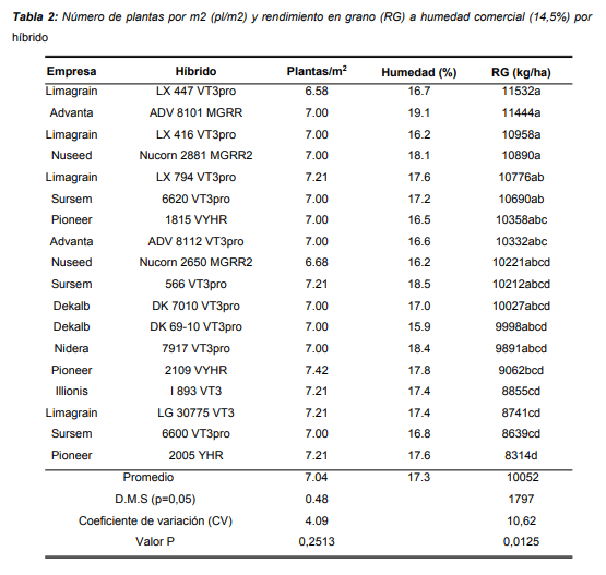 No se encontraron diferencias significativas entre híbridos en el número de plantas/m2 (p=0,2513). El promedio fue de 7,04 pl/m2 , con un máximo de 7,42 pl/m2 (Pioneer 2109 VYHR) y un mínimo de 6,58 pl/m2 (Limagrain LX 447 VT3pro) (Tabla 2). En cambio, en la variable Rendimiento en grano (RG) se encontraron diferencias significativas (p=0,0125). El rendimiento promedio fue de 10052 Kg/ha., con un máximo de 11532 Kg/ha (Limagrain LX 447 VT3pro), y un mínimo de 8314 Kg/ha. (Pioneer YHR) (Tabla 2).