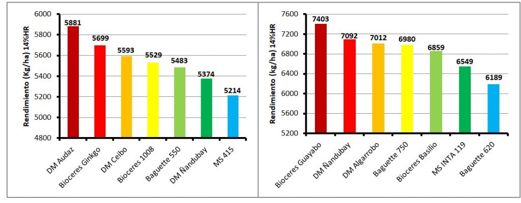 El ranking estuvo encabezado por el DM Audaz y sus 5.881 kg/ha, seguido por el Bioceres Ginkgo y el DM Ceibo con 5.699 y 5.593 kg/ha, respectivamente.