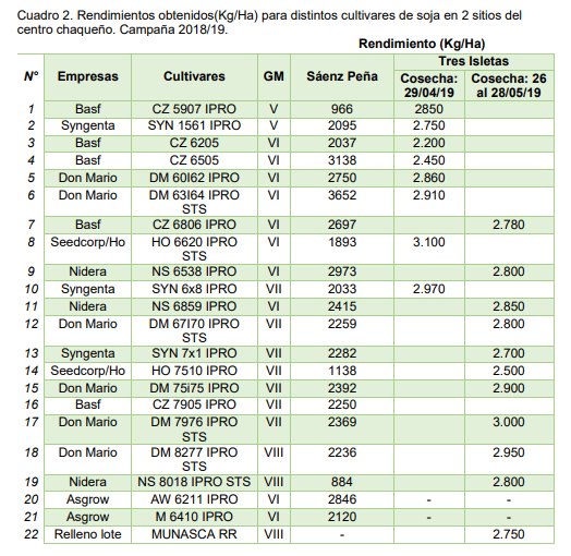 El presente documento resume la situación y resultado de los ensayos correspondientes a la campaña 2018/2019 llevada a cabo en la región NEA, provincia del Chaco, bajo la conducción de la EEA INTA Sáenz Peña y el apoyo de las empresas participantes de esta red. Objetivo: generar información, evaluar el comportamiento y rendimientos obtenidos para las distintas variedades de soja en distintos sitios de la provincia del Chaco. Los ensayos se llevaron a cabo en 4 localidades del centro Chaqueño: Sáenz Peña, Tres Isletas, Napenay y Avia Terai. Debido a las inclemencias ambientales no se han logrado registrar datos en las localidades de Napenay y Avia Terai. Los manejos adoptados en cada sitio fueron ajustadas al productor y las variedades evaluadas fueron propuestas por cada empresa participante, siendo detalladas en el cuadro de resultados.