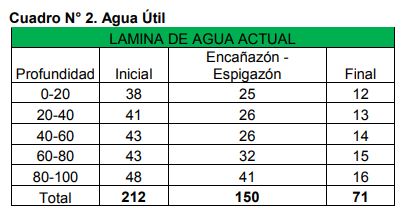 En lo que respecta a mediciones de Agua útil (Cuadro N° 2), se realizaron 3 mediciones que arrojaron los siguientes datos:
