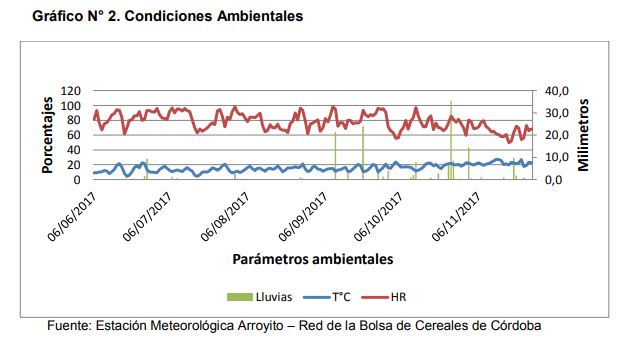 Los trabajos se realizaron en un establecimiento ubicado 4 km. al norte de la localidad de Rio Primero sobre un suelo Haplustol éntico, Serie Los Cometierra, clase IVsc con moderada a baja retención de humedad, drenaje algo excesivo y con limitante climática, muy característico de la zona (Carta de suelos de la República Argentina – Hoja Rio Primero, 2010); el lote provenía de un sistema de barbecho corto con antecesor soja. La siembra se realizó con una Sembradora Crucianelli, monotolva (2 cuerpos), utilizando un cuerpo por variedad y la densidad de siembra fue de aproximadamente 130 kg. de semillas/ha., utilizándose un fungicida como curasemilla a la siembra. En el Gráfico N° 1 pueden apreciarse los datos sobre las condiciones ambientales a las que estuvo expuesto el cultivo en la campaña triguera 2017.