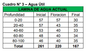 En cuanto a las mediciones de Agua Util (Cuadro N° 3) en el perfil del suelo, se realizaron 3 mediciones que arrojaron los siguientes datos: