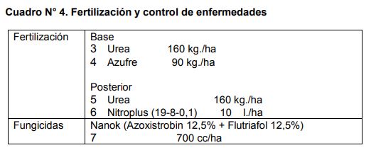 Con respecto a las precipitaciones ocurridas durante el ciclo del cultivo, si bien las mismas tuvieron su efecto positivo, es necesario volver a aclarar que el sistema fue con riego y “sin limitantes hídricas”. En el Próximo Cuadro se exhibe el esquema de fertilización y control de enfermedades.