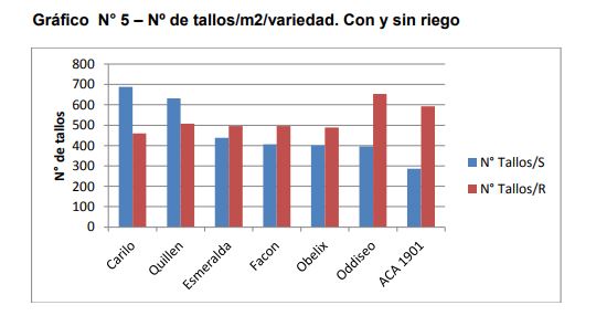 En la mayoría de los casos, el número de tallos/m2 es mayor en los sistemas con riego, salvo en el caso de Quillén y Cariló, que en secano, generaron un mayor número de tallos. Es importante destacar que las parcelas comparadas fueron cosechadas a mano y en el caso del sistema de secano se seleccionó unidades de muestreo en donde había un mejor stand de plantas (y por lo tanto mayor expresión del rendimiento) para poder comparar con el sistema de riego. Esta determinación se realizó de esta manera debido a que las macroparcelas tenían un stand de plantas desuniforme provocado por el problema de malezas comentado en párrafos anteriores.