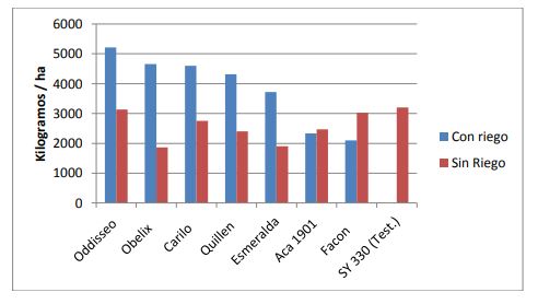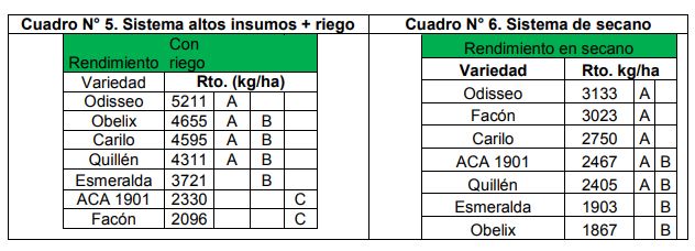 4- También es muy notable como algunas variedades como Obelix, de buen comportamiento en el sistema de riego, declina su rendimiento en el sistema de secano. La fundamentación de estos resultados podría ser explicado en que si bien la variedad tiene muy buena respuesta a la fertilización y el riego, la disminución de rendimientos en secano estaría explicada por su susceptibilidad a enfermedades.