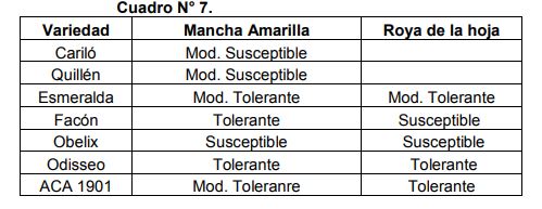 Se efectuó también un análisis respecto a la afectación provocada por las enfermedades Mancha amarilla y roya de la hoja (Cuadro N° 7), cuyos resultados se expresan a continuación.