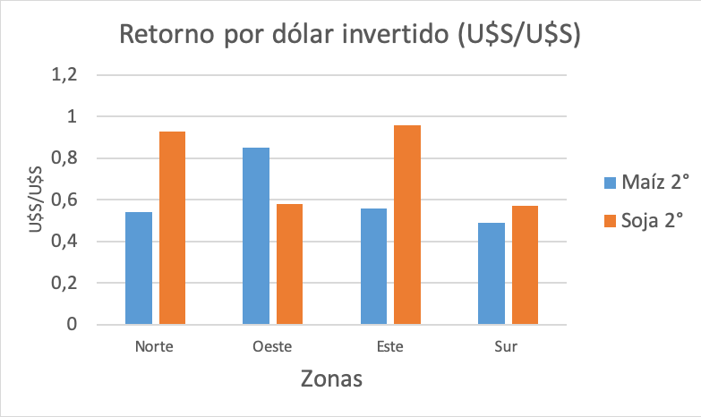 Se puede comparar ambos cultivos de acuerdo al margen bruto que se obtendría en cada zona y el gasto total en insumos y labores que requieren, el valor de esta ecuación es el retorno en dólares por dólar gastado (Tabla 2) además se adjunta los rendimientos promedios del quinquenio esperables para ambos cultivos. (Tabla 1)