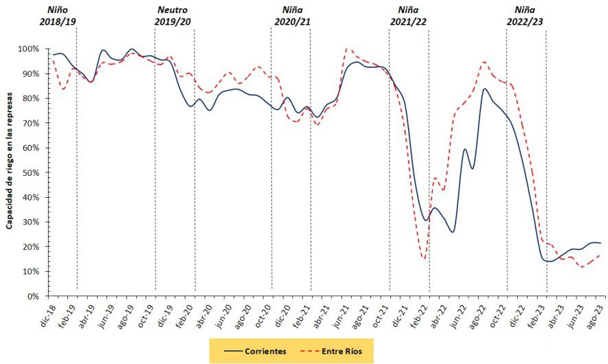 En la Figura 2 se muestra la evolución de la capacidad de riego de las represas en Corrientes y Entre Ríos y se detalla la situación del Pacífico Ecuatorial junto con el periodo de influencia en la región.