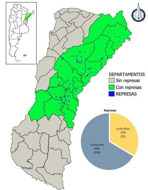 Cabe destacar que, la provincia de Corrientes posee el 66 % (109) de las represas totales, con una capacidad máxima de embalse de 27.700 ha, lo cual permitiría regar aproximadamente 61.000 ha.