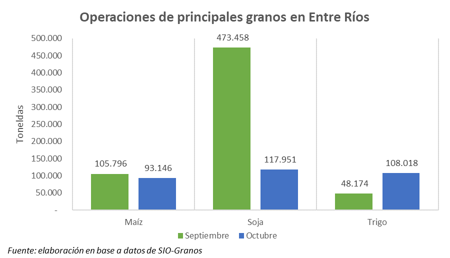 A partir de lo informado por la plataforma de SIO-Granos, durante el mes de octubre se registraron cerca de 400 operaciones finales por un total de 100 mil toneladas, representando un 15% a nivel país, gran parte de lo negociado corresponde a la futura cosecha 2022/23. Los precios promedios del trigo en las negociaciones mencionadas pasaron de unos $44.000 a $53.000 por tonelada aproximadamente.