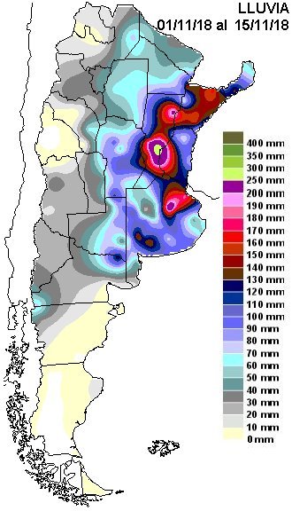 Tras una lenta recuperación hídrica que empezaba a insinuarse a partir de la última semana de octubre, se desarrolló un bloqueo húmedo que duró 72 horas en una amplia zona que alcanzó a las provincias de Santa Fe, Córdoba, Entre Ríos y Buenos Aires. La tormenta duró del 10 a 12 noviembre y alcanzó registros que superaron los 300 mm, sobre todo en el centro de Santa Fe. Las lluvias pueden apreciarse en la imagen de las lluvias de la primera quincena, gentileza de la consultora la consultora de climatología aplicada —CCA—.