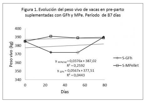 Las vacas recibieron 0,8 kg y 1,2 kg de Macropellet y Gluten feed húmedo de materia seca por día. La cantidad de proteína bruta recibida fue de 0,240 y 0,252 kg /Vc/día. En la figura 1 se presenta la evolución del peso vivo durante el período de 87 días. La pérdida de estado corporal fue mínima. La evolución del peso vivo fue más estable en el tratamiento con macropellet comercial.