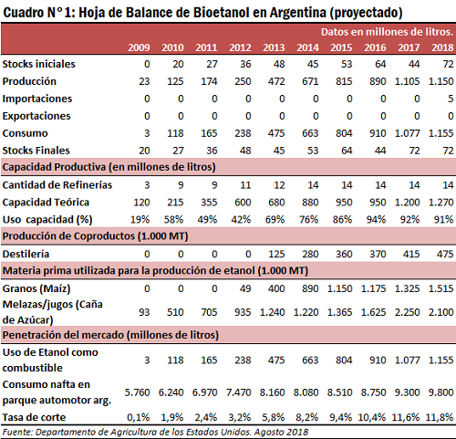 Tomando como referencia el informe anual de biocombustibles de Argentina publicado recientemente por el USDA, se observa que para el año 2018 la producción de bioetanol ascendería un 4,1% respecto al año anterior, alcanzando un volumen récord. A su vez, la capacidad productiva aumentaría un 5,8%. Por el lado de la demanda, el consumo como combustible subiría un 7,8% y se harían leves importaciones para poder cumplir con la tasa de corte obligatoria.