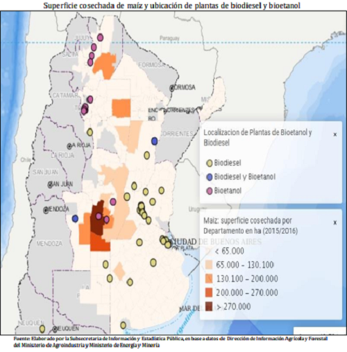 Actualmente, el país cuenta con 10 plantas industriales en base a azúcar localizadas en las provincias de Tucumán, Salta y Jujuy. Por otra parte, existen cinco plantas que producen etanol en base a granos (casi exclusivamente maíz) en el centro del país. La distribución geográfica de las fábricas de bioetanol (y también de biodiesel) se ilustra en el siguiente gráfico, tomado del informe de biocombustibles del Ministerio de Agroindustria, correspondiente al mes de agosto
