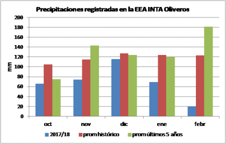 Desde octubre del 2017 hasta fin de febrero del 2018, se midieron 250 mm de precipitaciones por debajo del promedio histórico registrado en la EEA INTA Oliveros, tal como puede observarse en el gráfico. Las precipitaciones se registran desde el año 1951 y las acaecidas en esta campaña representan el valor más bajo de los últimos 29 años.