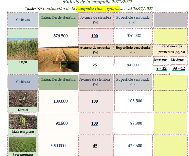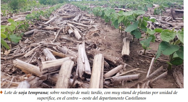 Para la campaña de cosecha gruesa 2021-2022, la intención de siembra de soja se estimó en unas 950.000 ha, con un incremento del 1,5 a 2 %, en referencia a la superficie alcanzada el año anterior, que fue de 935.000 ha. Hasta la fecha se logró un grado de avance en el proceso de implantación del 45%, unas 427.500 ha. Los primeros cultivares presentaron un muy buen estado, con un normal crecimiento, lográndose una correcta germinación y emergencia por las buenas condiciones ambientales ocurridas desde el inicio de la misma. 8 Se observaron los siguientes estados fenológicos: V “estados vegetativos”, VE (emergencia), Vc (estado de cotiledón, hojas unifoliadas pegadas), V1 (1º nudo)