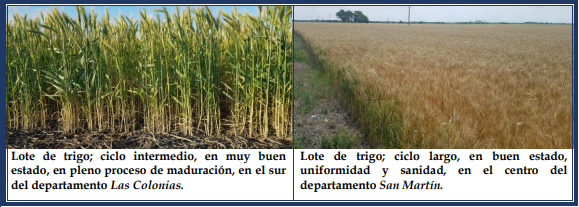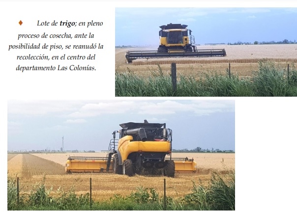 Los trigales, en sus distintos estadios fenológicos, continuaron su crecimiento, sin interferencias, con buena sanidad y no se detectaron plagas ni enfermedades. La alternancia de los escenarios de estabilidad – inestabilidad climática condicionaron y paralizaron el proceso de trilla en toda el área donde se venía desarrollando, particularmente en los departamentos del norte santafesino, General Obligado, Vera, Nueve de Julio, noroeste de San Javier, centro norte de San Justo, San Cristóbal y Las Colonias. A medida que las condiciones de piso o humedad de grano lo permitieron, lenta, gradual y progresivamente se reanudó la cosecha en los del centro, Castellanos, Las Colonias y La Capital. Se observó el movimiento de equipos y cosechadoras, lográndose un progreso del orden del 25 %, representando aproximadamente unas 94.000 ha recolectadas, con un adelanto intersemanal de 12 puntos. Los rendimientos promedios obtenidos no variaron hasta la fecha y oscilaron entre mínimos de 8 – 10 – 12 qq/ha y máximos que llegaron a los 38 – 40 – 41,5 qq/ha, con lotes muy puntuales de 42 – 42,5 qq/ha, reflejando el impacto de las lluvias heterogéneas, irregulares, variables y que se produjeron en alguna etapa del ciclo del cereal. Se determinaron los siguientes estados fenológicos: en un bajo porcentaje en 77 (grano lechoso avanzado) y el resto en 8 “grano pastoso”, 83 (comienzo de grano pastoso), 87 (pastoso duro) y los más avanzados, en 9 “madurez”, 91 (cariopse duro, difícil de dividir), 92 (cariopse duro, no se marca con la uña).