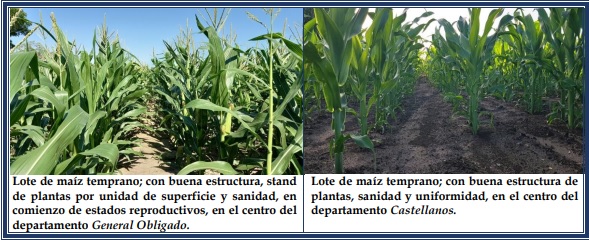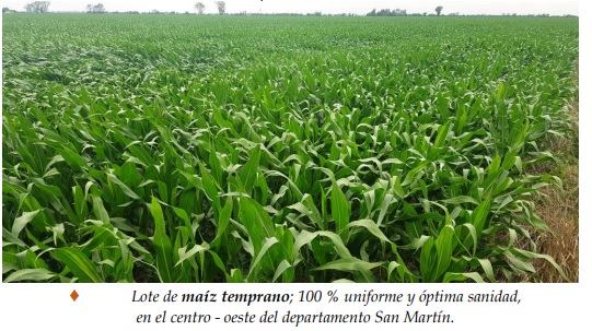 Las condiciones ambientales y la ideal disponibilidad de agua útil en los suelos, como consecuencia de las últimas lluvias de la semana, continuaron fortaleciendo a los maizales, los cuales evidenciaron muy buenos estados, con algunos lotes excelentes. La sanidad de los sembradíos se encontró muy bien, sin presencia de plagas ni enfermedades. Se observaron los siguientes estados fenológicos: V “estados vegetativos”, V3 (3º hoja desarrollada), V4 (4º hoja desarrollada), V5 (5º hoja desarrollada), V6 (6º hoja desarrollada), V7 (7º hoja desarrollada), V8 (8º hoja desarrollada), V9 (9º hoja desarrollada), V10 (10º hoja desarrollada), Vt (panojamiento) y los más avanzados, en R “estados reproductivos”, R1 (emergencia de estigma)