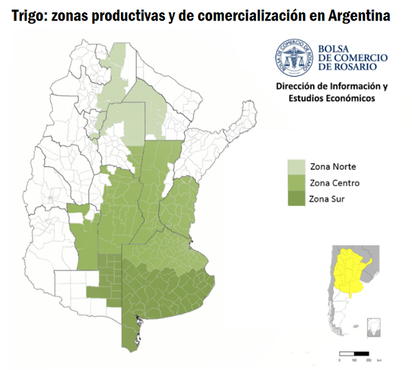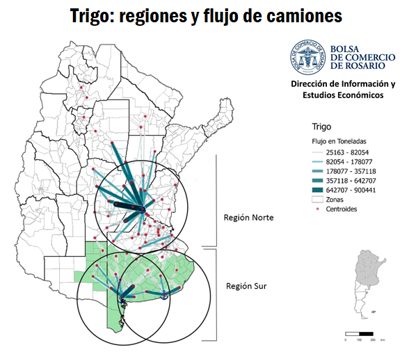 La división del territorio en estas dos grandes regiones tiene sentido a la luz de los principales nodos portuarios que sirven como salida del producto al exterior. Toda la exportación de la Región Norte utiliza como puerto de salida las terminales localizadas en el Gran Rosario, al sur de Santa Fe, en tanto que el trigo de la Región Sur se exporta o bien por el nodo Bahía Blanca o bien por el de Necochea/Quequén, ambos al sur de la provincia de Buenos Aires.