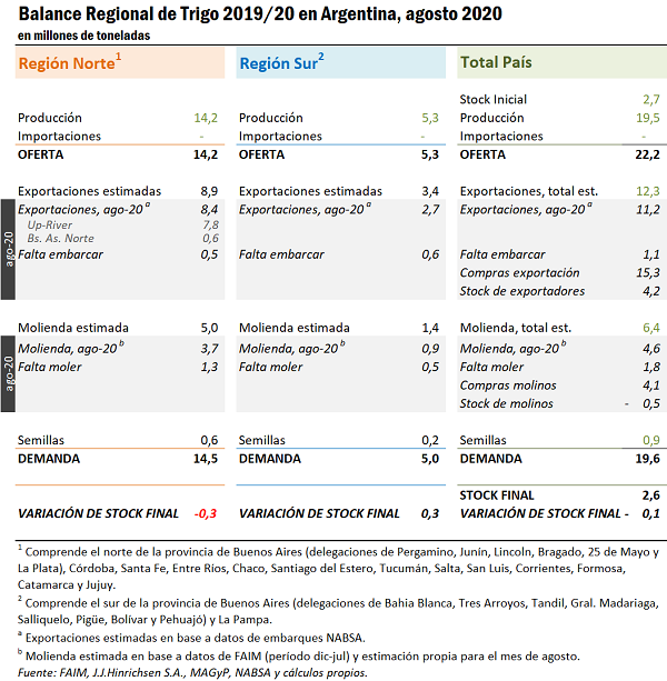 A nivel consolidado, entonces, Argentina lleva embarcado 11,2 Mt de trigo 2019/20 y resta despachar 1,1 Mt. En lo que refiere a las compras de las compañías exportadoras de trigo, estas totalizan 15,3 Mt hasta agosto. Dicho volumen de mercadería cubre los embarques objetivo estimado para la campaña. Computadas los embarques de agosto, resta despachar 1,1 Mt de trigo 2019/20, por lo que los inventarios en mano de los exportadores ascienden a 4,2 Mt. Esto garantizaría que las compañías exportadoras que operan en ambas regiones cuentan ya con la mercadería para cumplir con los embarques estimados.