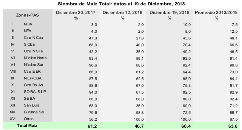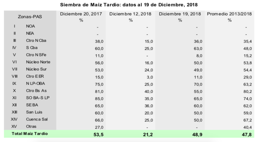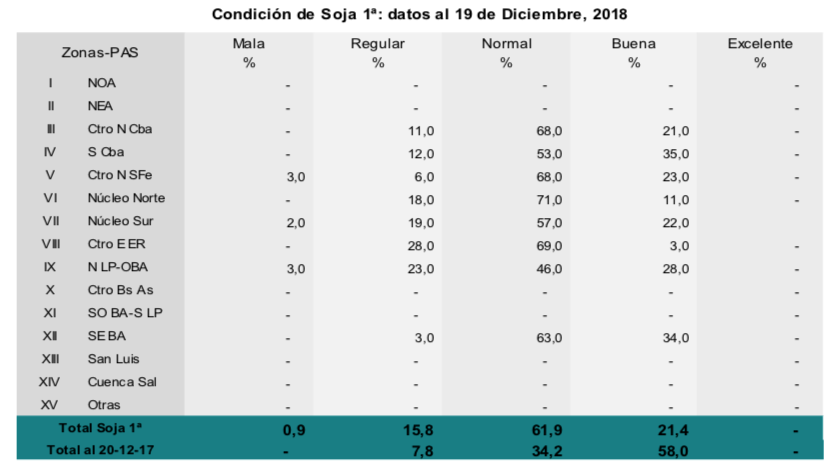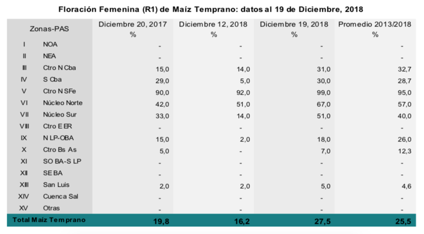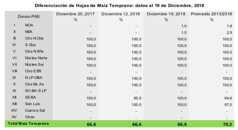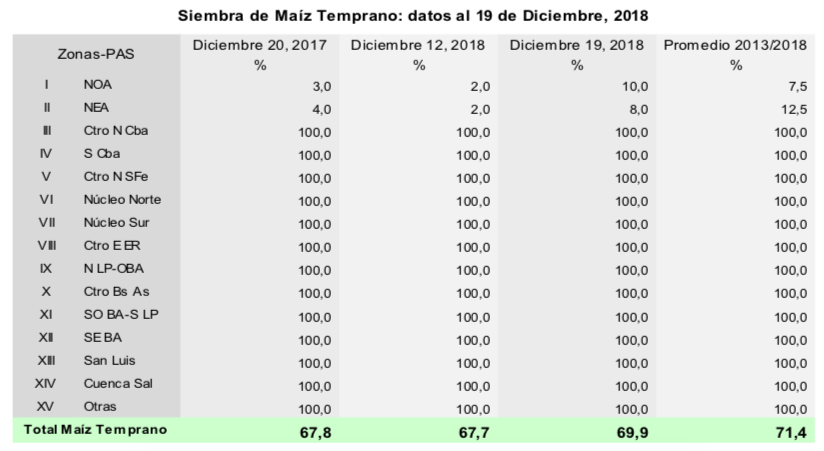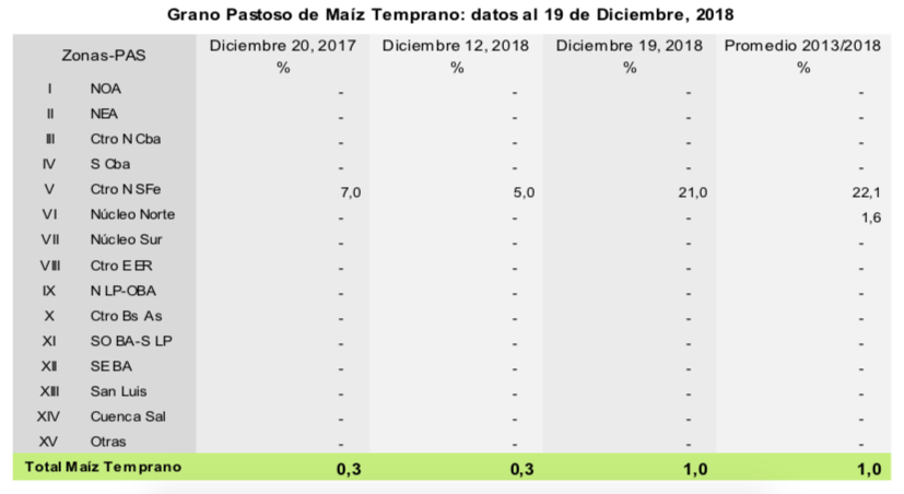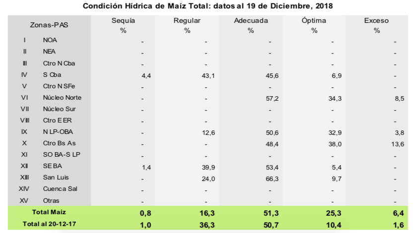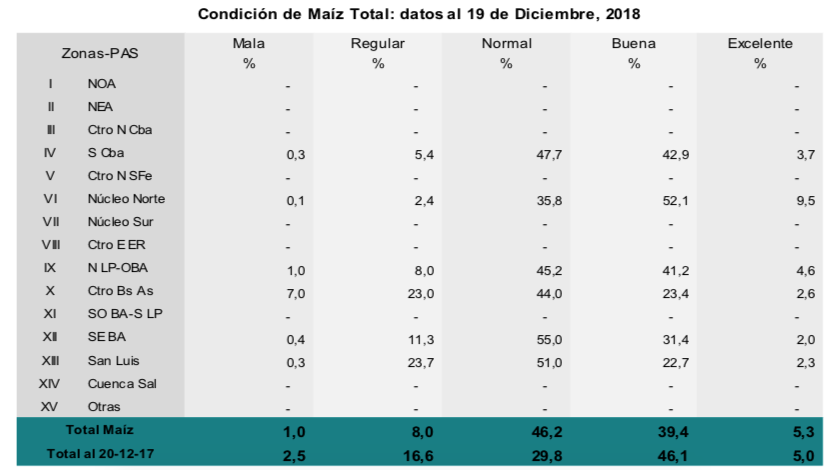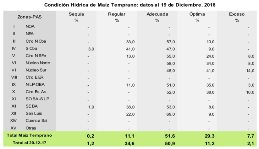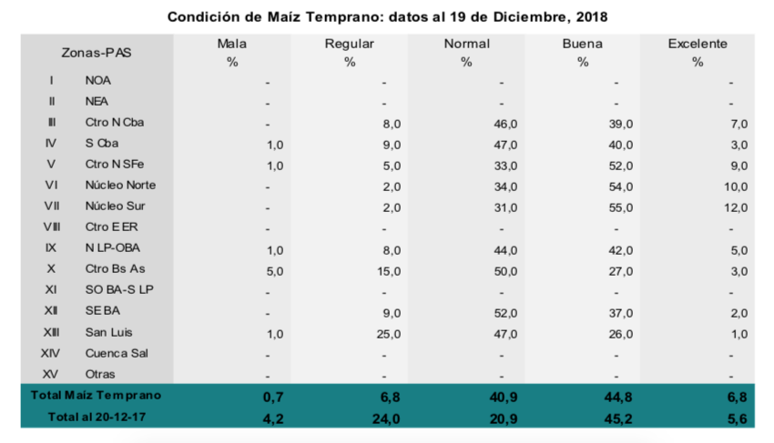 Para el caso de maíz, el 92,5 % de los lotes implantados en fecha temprana se encuentran en condición normal a excelente. Las abundantes lluvias registradas han tenido un impacto en general positivo, considerando que el 37,7 % de los maíces tempranos se encuentran en etapas reproductivas. De todas formas, si han impactado en las labores de siembra tardía, sobre todo en el centro y sur de Buenos Aires donde se perciben atrasos relativamente importantes.