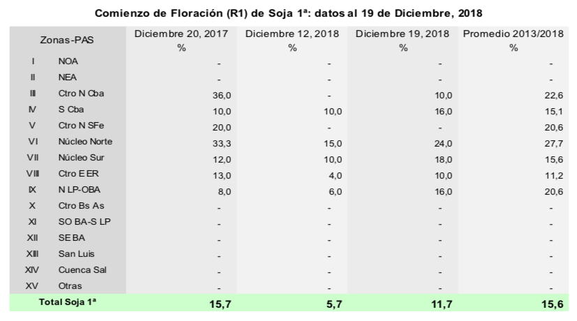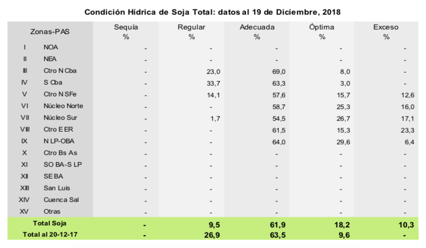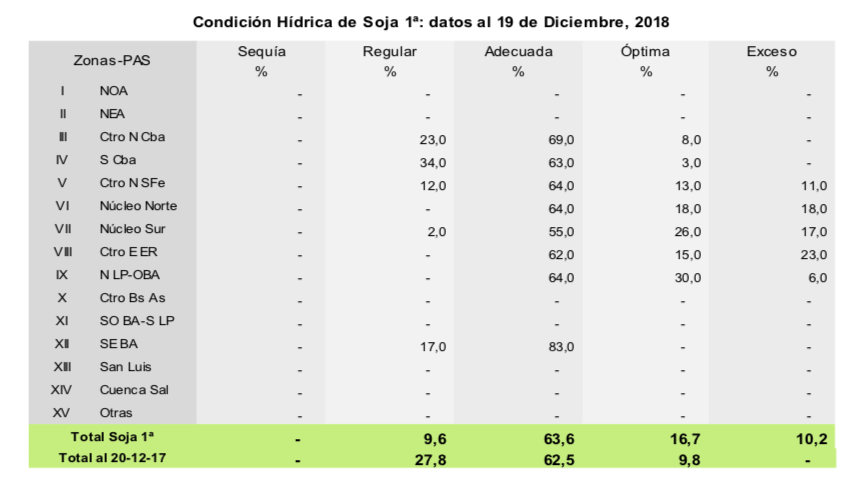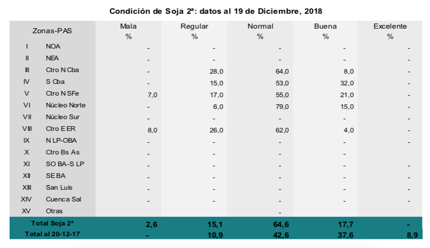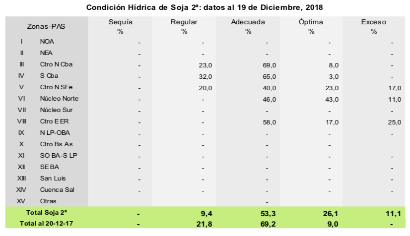 En la última semana, precipitaciones registradas en gran parte del área agrícola incrementaron la superficie afectada por excesos hídricos, la cual ascendió al 10,3 % del total. Como había sucedido con soja de primera, las lluvias en el centro del área agrícola afectaron nuevamente la implantación de soja de segunda, elevando la existencia de lotes con condición de cultivo de regular a mala. En cambio, hacia el sur del país se incrementó la proporción de lotes con regular humedad que, si bien limitan las labores de siembra, no afectan por ahora la condición de los cuadros ya implantados. En cuanto al desarrollo fenológico, los primeros lotes implantados se encuentran en floración, registrando un retraso interanual de 4 puntos porcentuales debido a las bajas temperaturas (campaña 2016/17 15,7% – 11,7% campaña 2017/18).