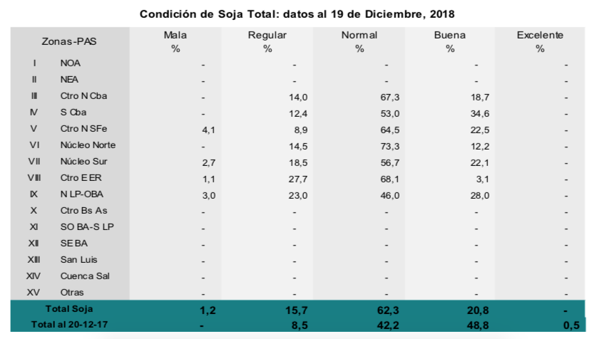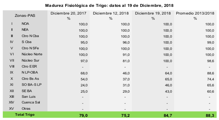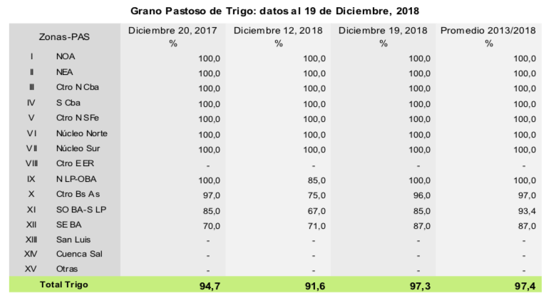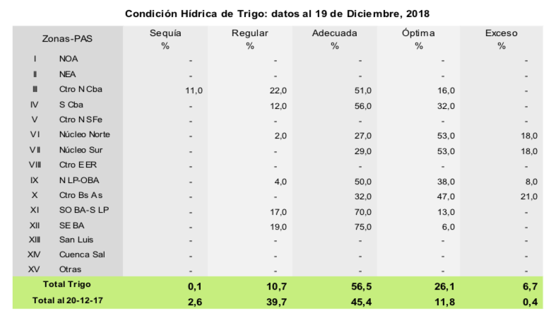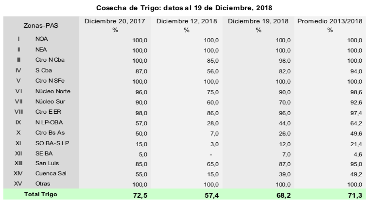 La recolección de trigo avanzó 10,8 puntos porcentuales en la última semana, quedando en pie 1.947.628 hectáreas de las cuales el 82,3% se encuentra en condición normal a excelente. Sin embargo, los eventos de lluvias ocurridos se traducen en atrasos en las labores de cosecha y por consiguiente en la siembra de los cultivos de segunda. Respecto a los eventos de granizo de la semana pasada, se esperan mermas de rendimiento sobre todo en el norte de la Pampa, el sur de Córdoba y el oeste de Buenos Aires.
