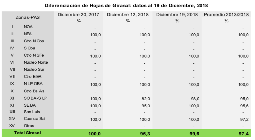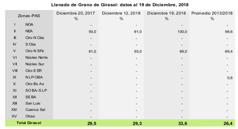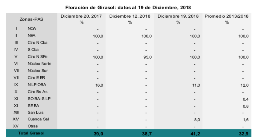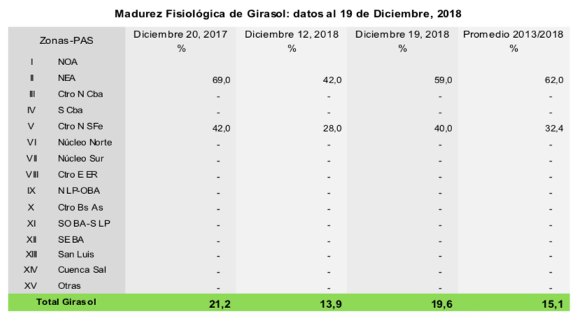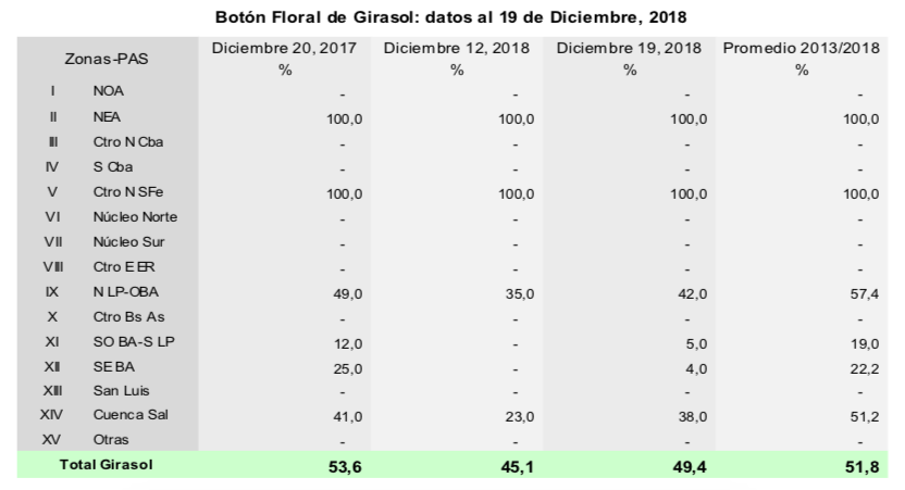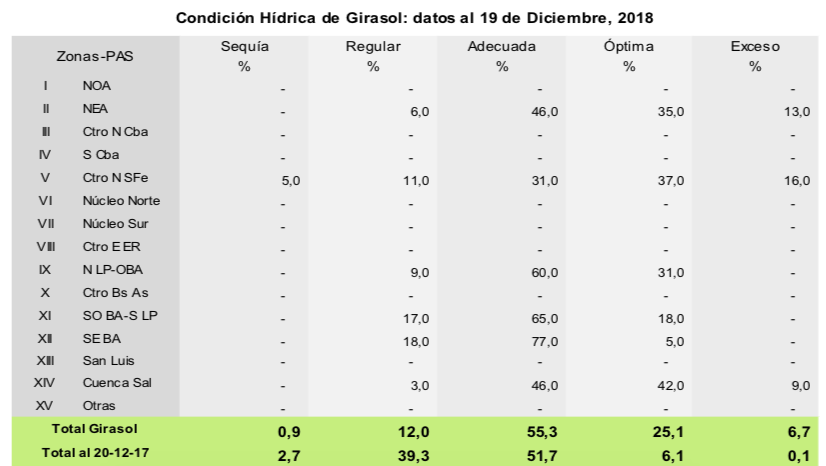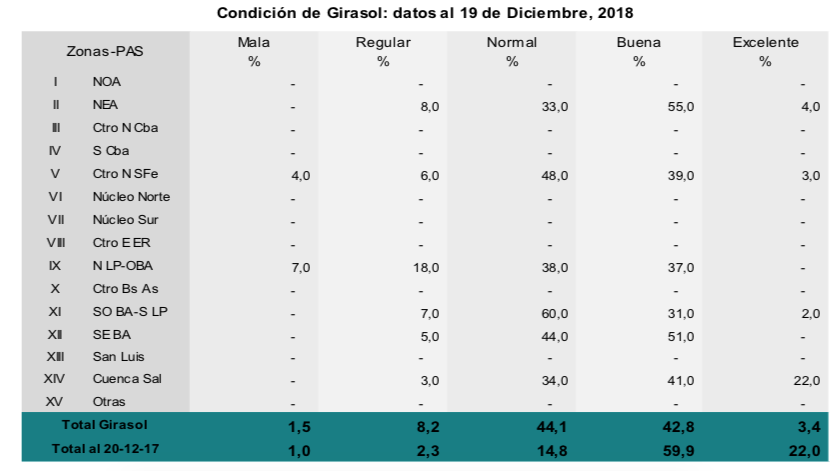 Por su parte, de las 1.900.000 hectáreas implantadas con girasol, el 90,3 % se encuentra con una condición normal a excelente bajo tres escenarios: al norte de la región agrícola, atravesando el final de la etapa de llenado y madurez, hacia el centro transitando la etapa de floración, y finalmente al sur recién empezando a asomar el botón floral. Sin embargo, a pesar de que el 80,4 % de los lotes presentan condición hídrica adecuada a óptima, no se descartan posibles fallas en la polinización debido a los eventos de lluvias.
