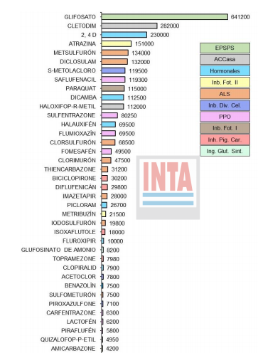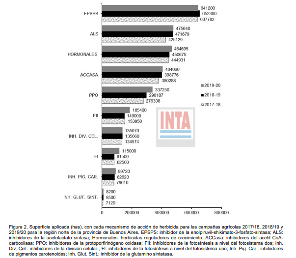 Los resultados obtenidos con respecto al uso de herbicidas indican que, de los diez mecanismos de acción relevados, los cinco mecanismos con mayor superficie aplicada fueron glifosato (inhibidor de la EPSPS), inhibidores de la acetolactato sintasa (ALS), hormonales (acción similar a las auxinas sintéticas), graminicidas (inhibidores del acetil CoA-carboxilasa, ACCasa) y los inhibidores de la enzima protoporfirinógeno oxidasa (PPO) (Figura 2).
