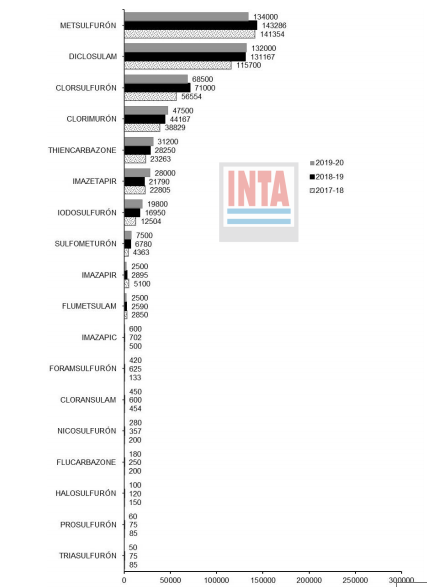 Figura 3. Superficie aplicada (has), con cada ingrediente activo de inhibidores de la acetolactato sintasa (ALS) para la región norte de la provincia de Buenos Aires en las campañas agrícolas 2017/18, 2018/19 y 2019/20.