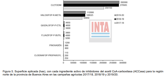 Los resultados obtenidos indican que dentro de los herbicidas inhibidores del acetil Coa-carboxilasa cletodim fue el principio activo de mayor uso en las últimas tres campañas agrícolas seguido de haloxifop R metil (Figura 5). Se debe destacar el incremento en el uso de estos dos herbicidas en los últimos dos periodos de relevamiento respecto al periodo 2017/18 (Figura 5).