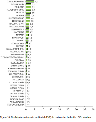 Respecto al impacto ambiental de cada herbicida (cuantificado por el EIQ de campo), se observaron que atrazina, pendimetalín, acetoclor y trifluralina son ingredientes activos con un EIQ medio (<45) (Stewart y otros, 2011). Un 32 % de los ingredientes activos utilizados son de bajo impacto ambiental (5><EIQ<20) entre los que se destacan glifosato y 2,4 D, herbicidas con alto grado de uso. Es importante destacar que el 61 % de los activos registrados presentaron un muy bajo EIQ (><5) (Stewart y otros, 2011), en tanto no se registró el uso de ingredientes activos con un alto impacto ambiental (EIQ>45) (Figura 15). Se debe tener presente que, si bien los EIQs de los ingredientes activos relevados son en general bajos y muy bajos, los programas de control de malezas asociados a las secuencias de cultivos de la región pueden tener un impacto ambiental alto (EIQ>45) al hacerse un uso repetido a lo largo del ciclo de crecimiento de los cultivos (Principiano y Acciaresi, 2017). Así, el incremento en la frecuencia de especies resistentes y tolerantes en la región, lleva a un intenso y alto uso de herbicidas a los efectos de controlar dichas especies con el consecuente incremento en el impacto ambiental.
