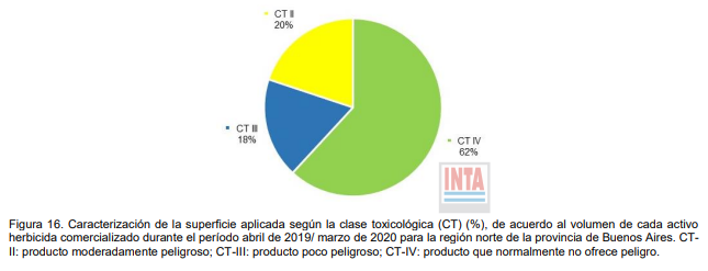 Con la información relevada fue posible determinar el grado de uso de herbicidas en la región, clasificados por su banda toxicológica (Figura 16). Así se observó que el 62 % de la superficie aplicada corresponde a ingredientes activos de la clase toxicológica IV (banda verde, producto que normalmente no ofrece peligro), entre los que se incluyen todas las formulaciones de glifosato, atrazina, diclosulam, metsulfurón y dicamba, entre otros. Un 20 % de la superficie aplicada se realizó con ingredientes activos que pertenecen a la clase toxicológica II (banda amarilla, producto moderadamente peligroso), donde se destacan ingredientes activos tales como 2,4 D, haloxifop R metil y paraquat. Finalmente, un 18 % de la superficie se aplicó con productos de clase toxicológica III (banda azul, producto poco peligroso), entre los que se pueden encontrar ingredientes activos relevantes como cletodim, fomesafén, s-metolacloro, entre otros (Figura 16).