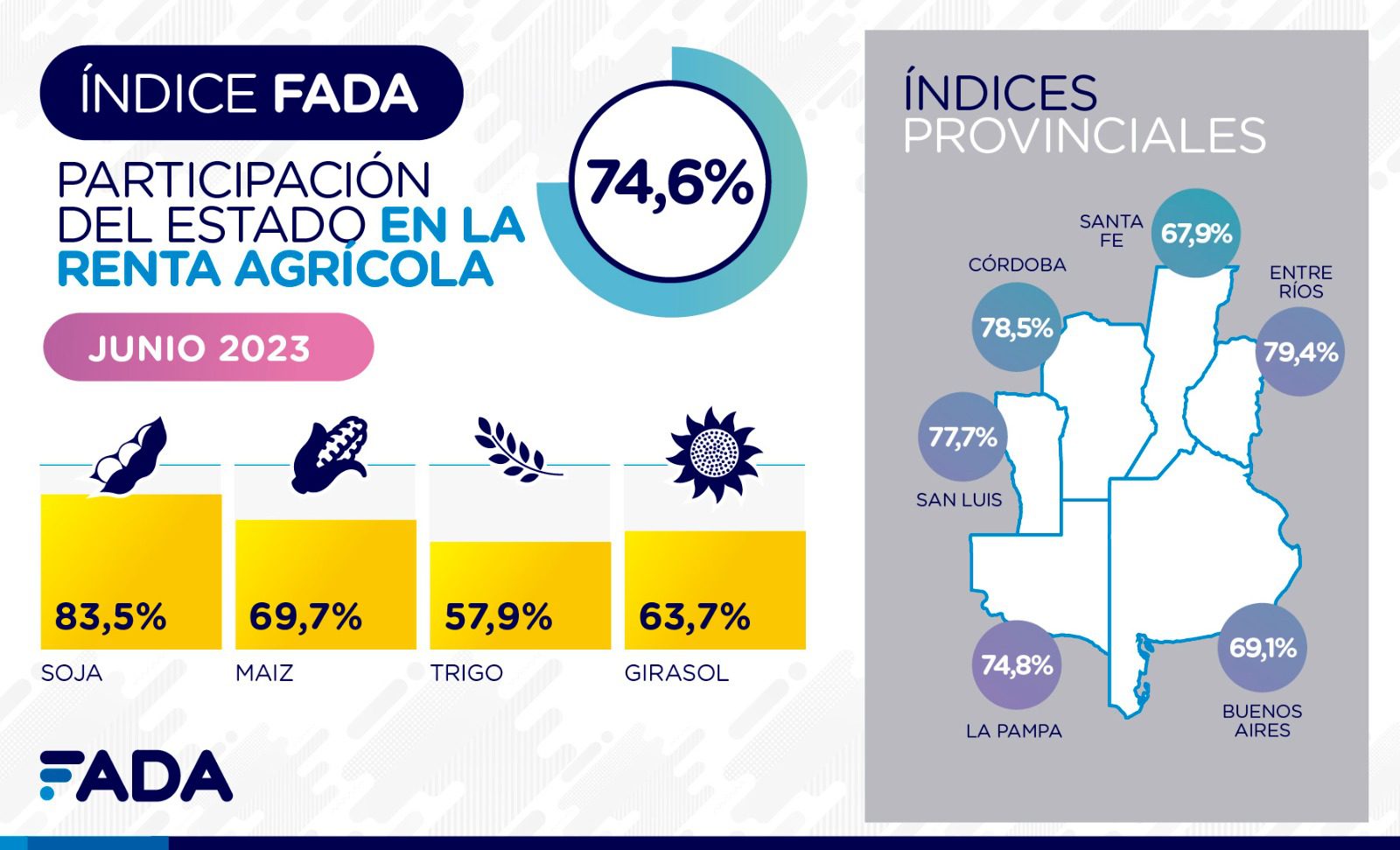 Por provincia. Mientras el índice FADA nacional es de 74,6%, Córdoba registra 78,5%, Buenos Aires 69,1%, Santa Fe 67,9%, La Pampa 74,8%, Entre Ríos 79,4% y San Luis 77,7%. Particularmente, en el caso de soja, 5 de las 6 provincias tienen un índice superior a 80%. En todas las provincias analizadas se paga impuesto inmobiliario rural e impuesto a los sellos para la compraventa de granos.