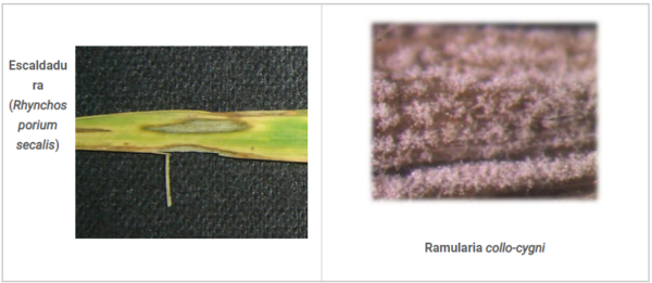 . Control de Ramularia collo cygni: este patógeno es muy sensible a carboxamidas (bixafen, fluxapyroxad e isopyrazam, entre otras) y a triazolintionas (prothioconazol), y medianamente a baja sensibilidad sólo a epoxiconazol dentro de la familia de los triazoles. En el caso de aplicación: entre estadio hoja bandera hasta aristas visibles.