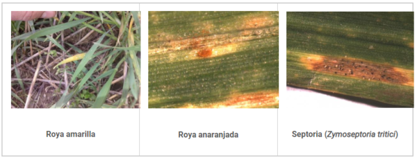 Para el caso del trigo, ya se observan lotes con roya amarilla (Puccinia striiformis) sobre todo en aquellos sembrados con variedades susceptibles. También se han observado las primeras pústulas de roya anaranjada (Puccinia triticina). En el caso de manchas predomina la mancha amarilla (Drechslera tritici repentis) y en menor prevalencia mancha por Septoria (Zymoseptoria tritici).