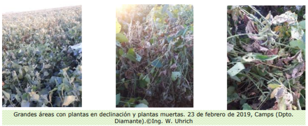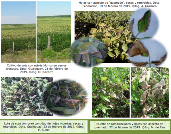 Los cultivos de soja de primera en estadios reproductivos avanzados (R5.5 – R6) mostraron durante la semana anterior signos de un fuerte estrés por déficit hídrico, especialmente en el centro – oeste de Entre Ríos (Figura 1), que podrían revertirse con las lluvias recientes. * Los cultivos de segunda se observan en estadios reproductivos R3 y R4, con avance de enfermedades foliares.