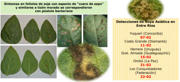 Las enfermedades relevantes de las hojas son: mancha marrón (MM) por Septoria glycines, tizón bacteriano (TB) por Pseudomonas savastanoi pv. glycinea, roya asiática (RAS) por Phakopsora pachyrhizi, pústula bacteriana (PB) por (Xanthomonas axonopodis pv. glycines) y tizón morado (TF) por Cercospora spp.