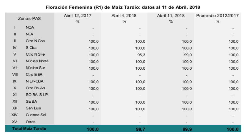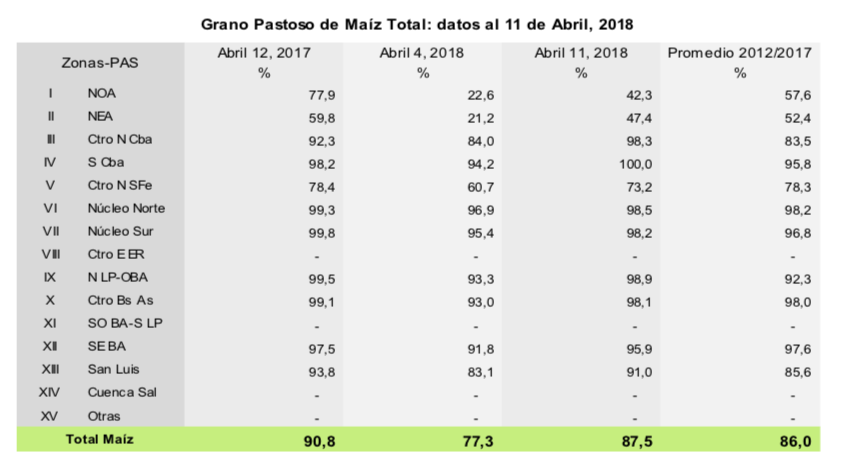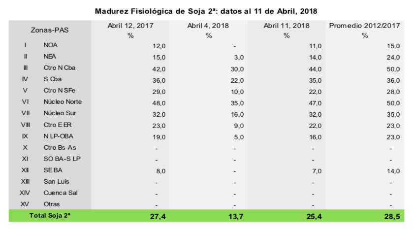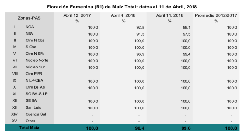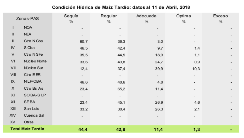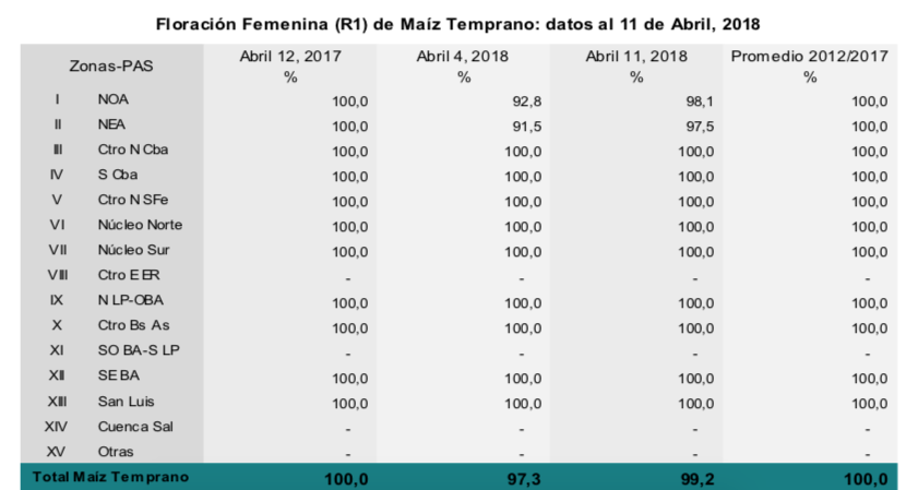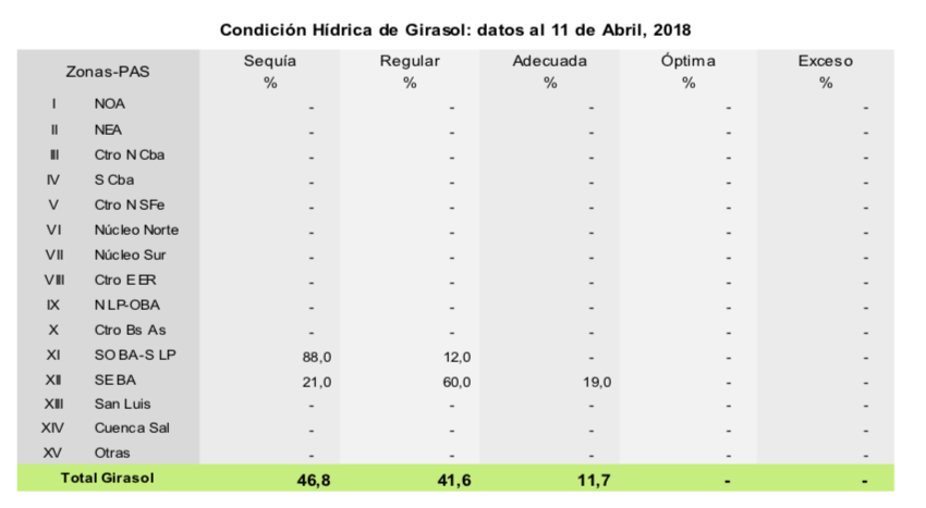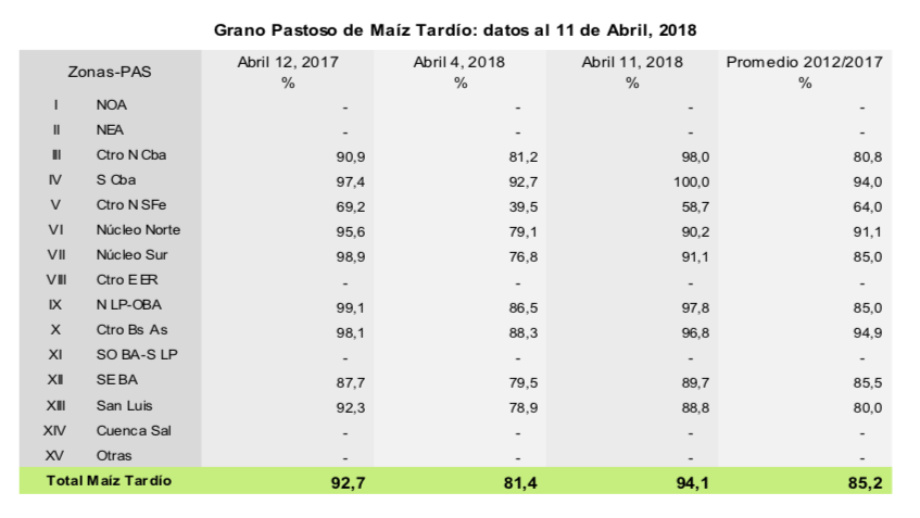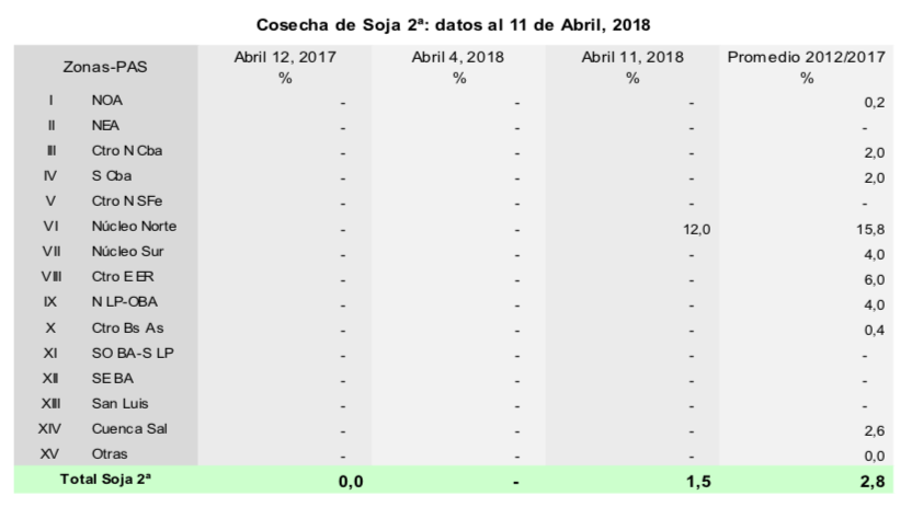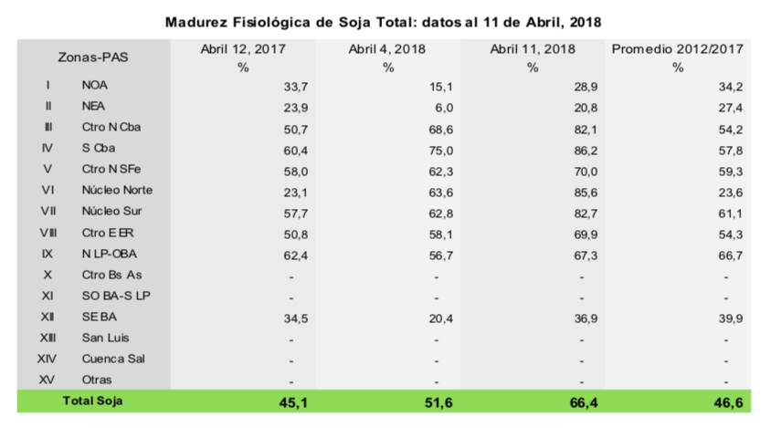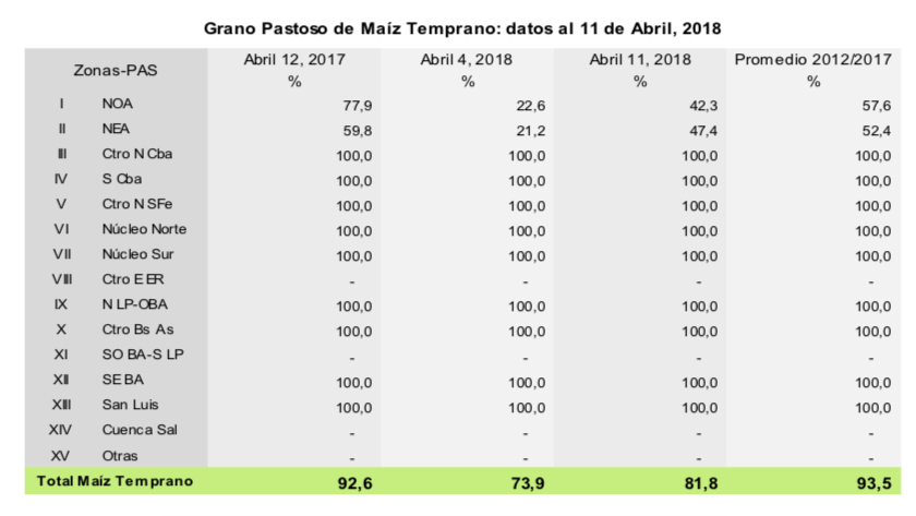 Resultados del relevamiento realizado al 11 de abril de 2018. Las zonas-PAS incluidas en este informe aportan el 90 % del área sembrada con cada cultivo y los datos zonales de fenología se comienzan a publicar una vez finalizada la siembra. Los valores nacionales de siembra, cosecha y fenología se encuentran ponderados por el área proyectada, mientras que la condición de humedad y de cultivo por las hectáreas sembradas o remanentes.
