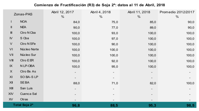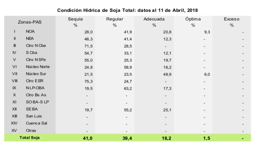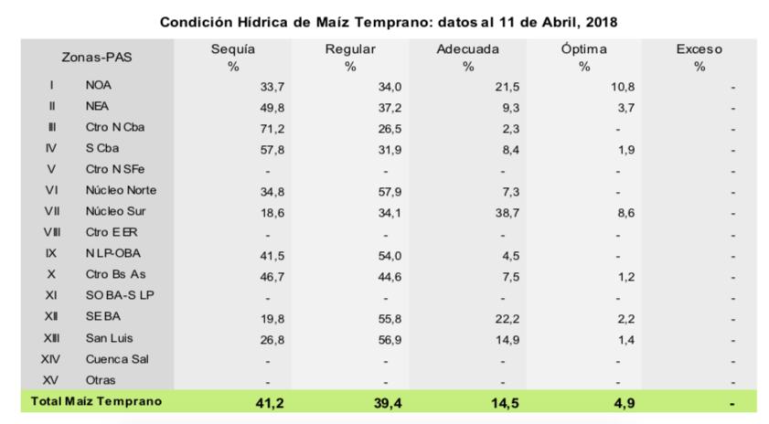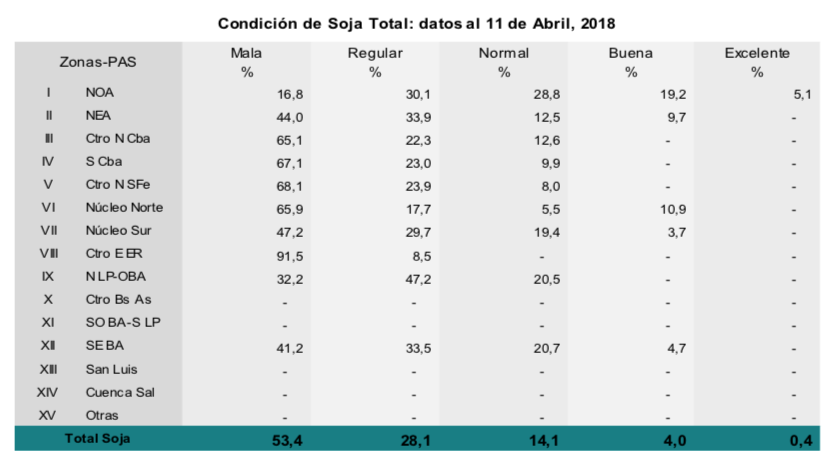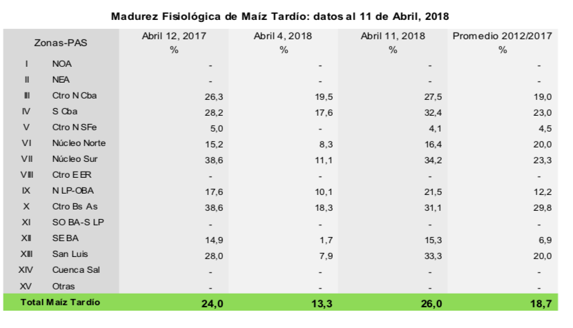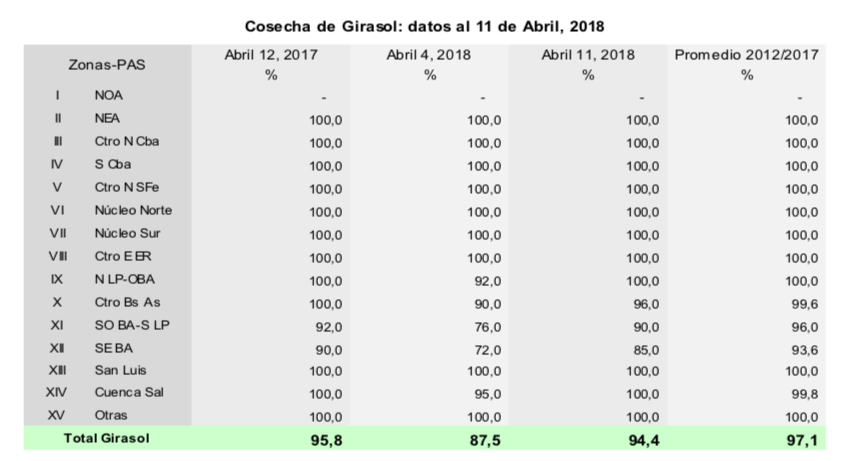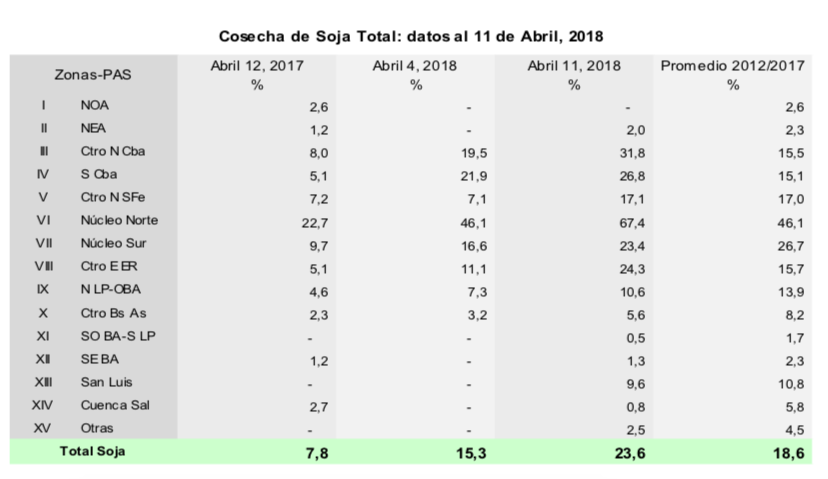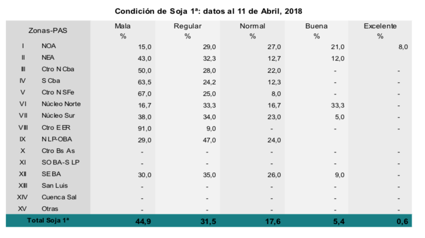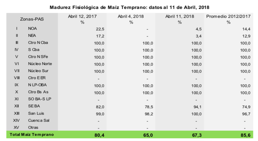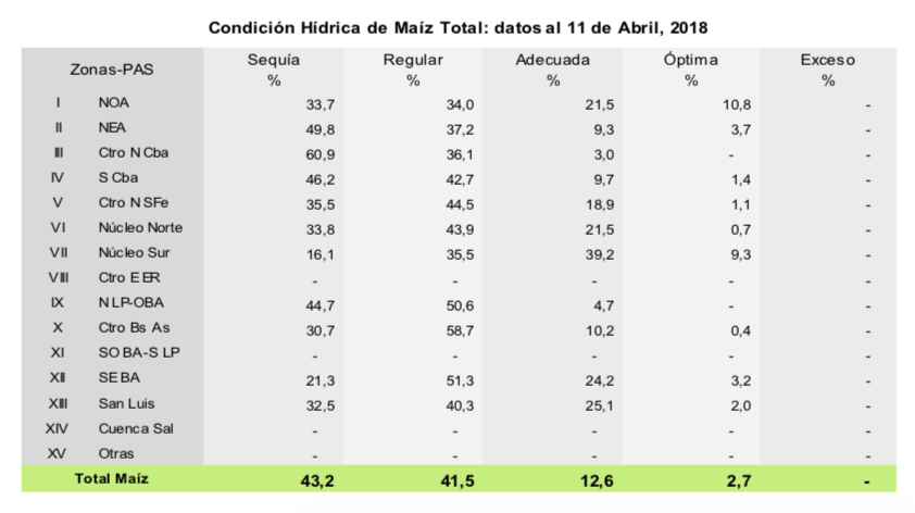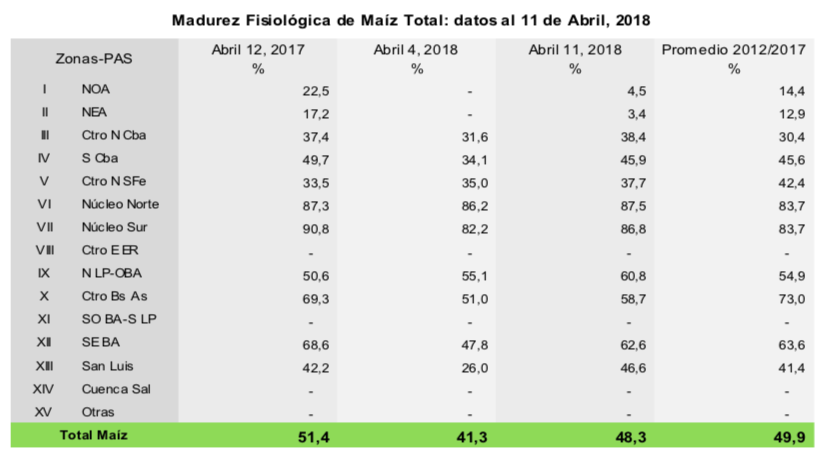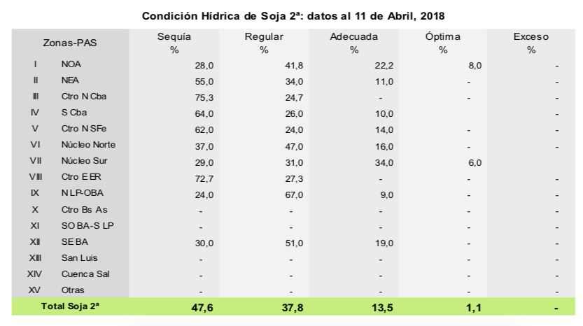 Resultados del relevamiento realizado al 11 de abril de 2018. Las zonas-PAS incluidas en este informe aportan el 90 % del área sembrada con cada cultivo y los datos zonales de fenología se comienzan a publicar una vez finalizada la siembra. Los valores nacionales de siembra, cosecha y fenología se encuentran ponderados por el área proyectada, mientras que la condición de humedad y de cultivo por las hectáreas sembradas o remanentes.