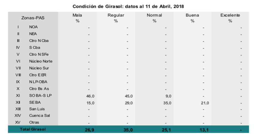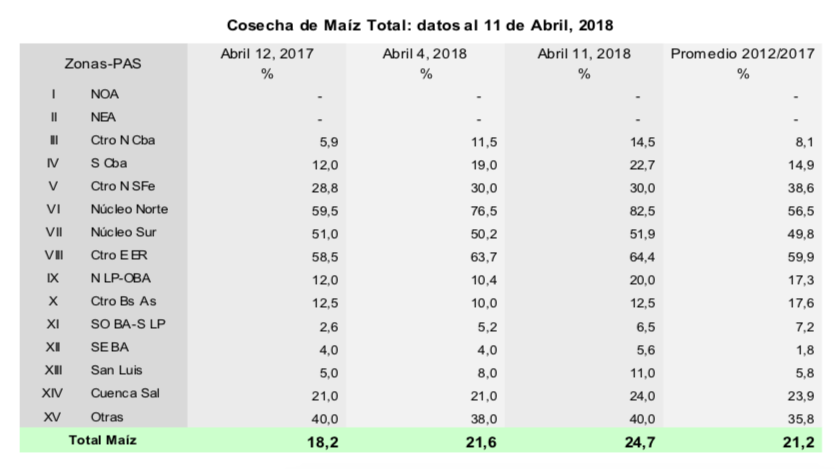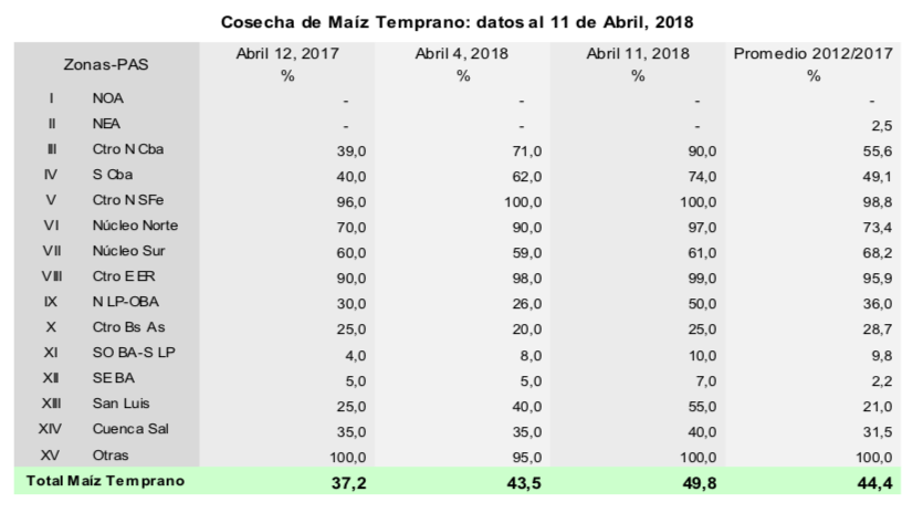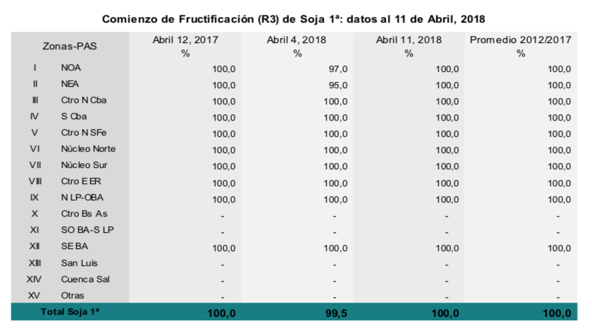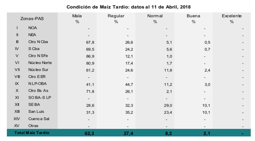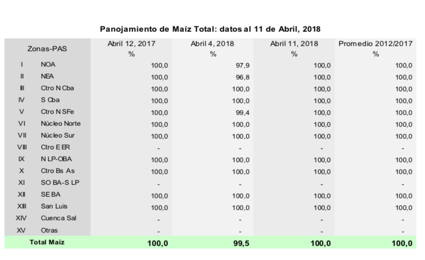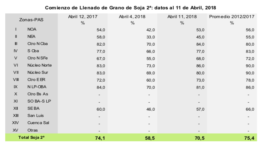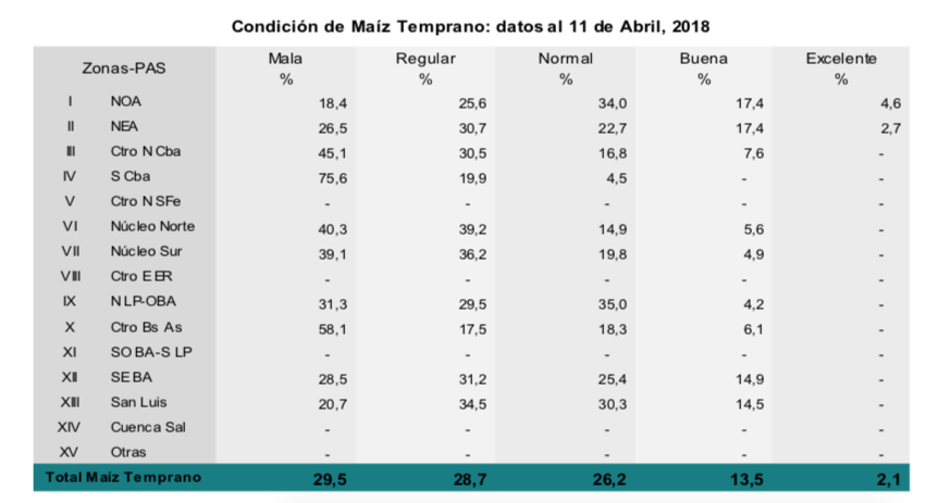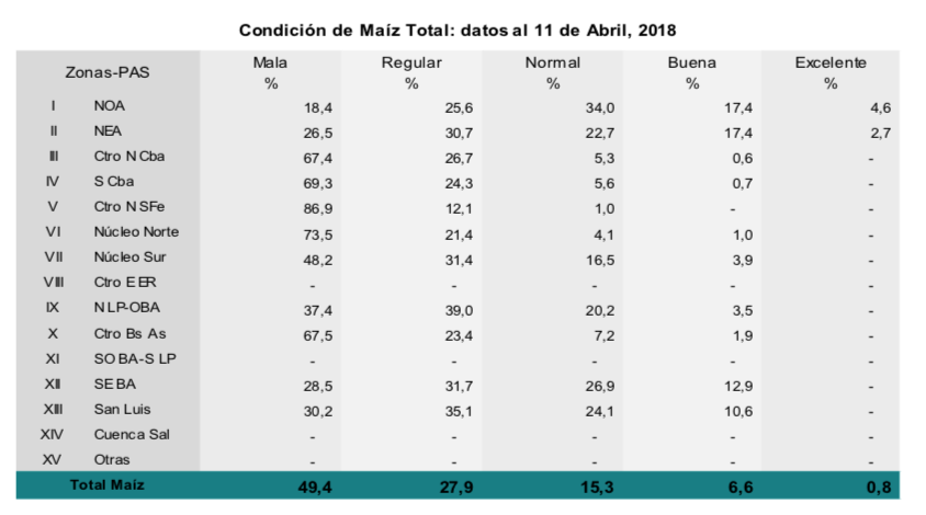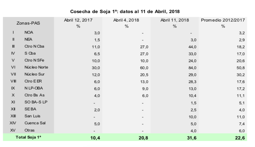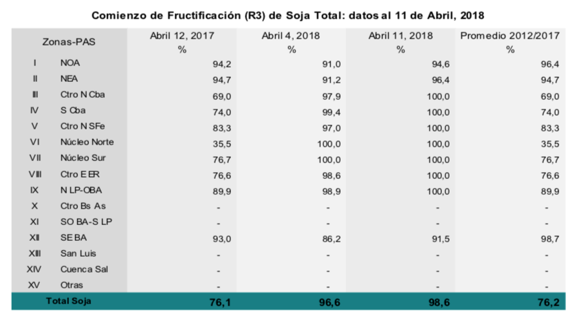 Resultados del relevamiento realizado al 11 de abril de 2018. Las zonas-PAS incluidas en este informe aportan el 90 % del área sembrada con cada cultivo y los datos zonales de fenología se comienzan a publicar una vez finalizada la siembra. Los valores nacionales de siembra, cosecha y fenología se encuentran ponderados por el área proyectada, mientras que la condición de humedad y de cultivo por las hectáreas sembradas o remanentes.