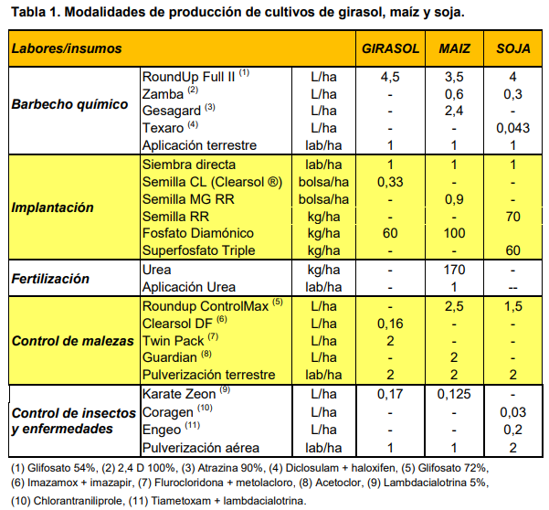 Para valorizar los costos, se utilizaron los precios vigentes en agosto de 2019, tanto para las labores como los gastos de cosecha, gastos de comercialización y fletes. Los precios de los insumos (agroquímicos y fertilizantes) se tomaron a valor dólar con una cotización de 60 $/u$s. Los modelos de producción zonales de los cultivos de girasol, maíz y soja se presentan en la Tabla 1.